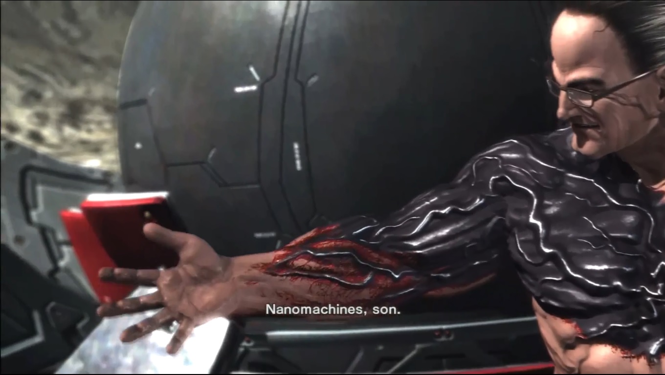 — senator steven armstrong and raiden after armstrong powers up his nanomachines.
